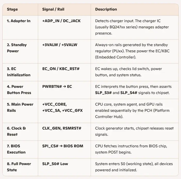 • EC role: The EC controls sequencing; if EC firmware is corrupted, power-on may fail even if rails are good.